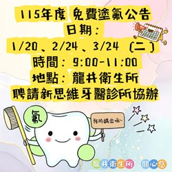 115年度1-3月衛生所塗氟門診公告 臺中市龍井區衛生所 2026-01-15 115年度1-3月衛生所塗氟門診公告 📢 免費幼兒塗氟門診時間公告 時間:上午09:00–11:00 (11點截止掛號) 承接單位:新思維牙醫診所-魏境霆醫師 注意事項:不需要費用,可先電話預約 請攜帶「健保卡」於服務時段內完成報到。 預約專線:04-26352228分機206陳護理師