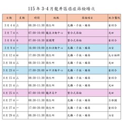 115年3-4月龍井區衛生所免費健康篩檢時程表 臺中市龍井區衛生所 2026-02-24 115年3-4月龍井區衛生所免費健康篩檢時程表 ★篩檢對象 子宮頸抹片:25-29歲,曾有性行為女性(86-90年次)/3年1次。 30歲(含)以上,曾有性行為女性(85年次(含)以前出 生)/一年1次。 乳房攝影:40-74歲婦女(41-75年次)/2年1次。 大腸癌篩檢:40-44歲二等親有大腸癌家族史者(71-75年次)。 ...