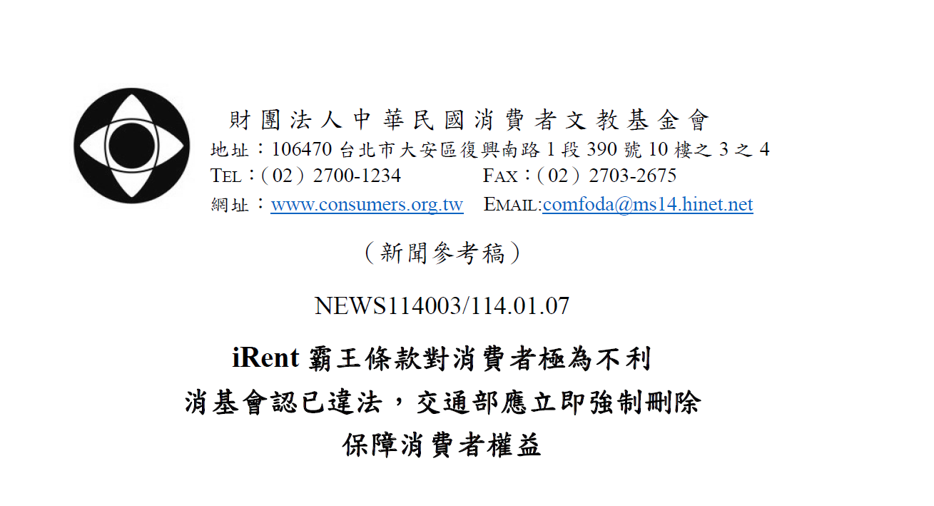 115年4-6月消費者保護宣導-iRent 霸王條款對消費者極為不利,消基會認已違法